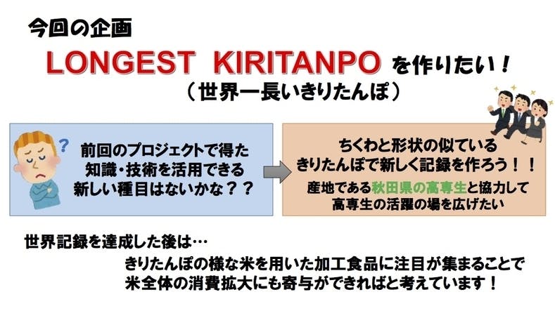 今回は世界記録樹立に向けて,前回のちくわプロジェクトで得た知識、技術を活用できる新しい種目『longest kiritanpo(世界で最も長いきりたんぽ)』に新規設定しその記録樹立に挑戦していきます。