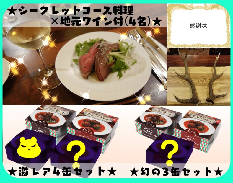 返礼品は9種類用意いたしました。感謝状、缶詰のセット、ペペネーロでのお食事券、本物の鹿の角などがございます。