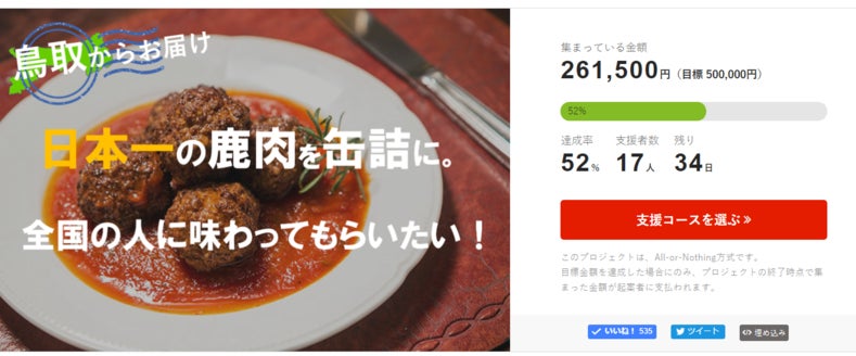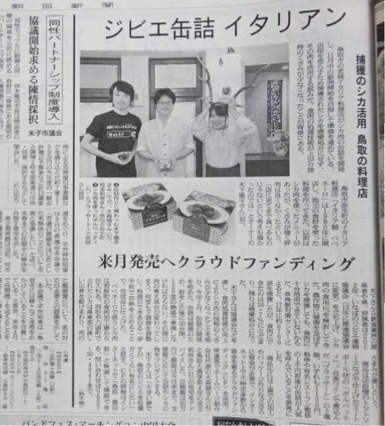 こんにちは!クラウドファンディング広報担当の児玉です。 タイトルの通り、なんと!試食会を開催します。 鹿肉のポルぺッティ~香り高い特製トマトソース煮~ 鹿肉のブラッサート~野菜の旨味たっぷり赤ワイン煮~ 商品化予定のこの2つが試食できます。ペペネーロオーナー木下が鳥取産鹿肉の有効活用、絶品な調理法を追求し続けてたどり着いた缶詰です。じっくりと時間をかけて丹精込めて作っている、手作り缶詰なのでこの機会にぜひご試食ください! 日時:10月18日(木)19日(金) お昼の営業時間11:30~14:00場所:ペペネーロさん(鳥取県鳥取市弥生町308-2)※駐車場はございません ※予約は不要です試食は無料です。(1品もしくは1ドリンクご注文ください)お昼休憩に是非お試しください