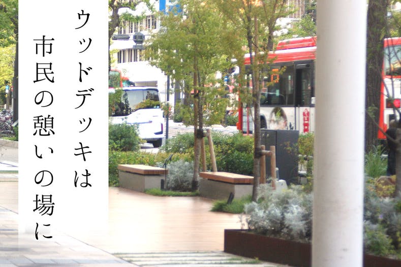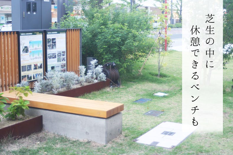 リニューアル前は、どこにでもありそうなただのコンクリートでできた歩道でしたが、今はウッドデッキや自然石を使った美しい地面、芝生や木々など自然も溢れ、冬になればライトアップもされ、また違った顔を見せてくれます。