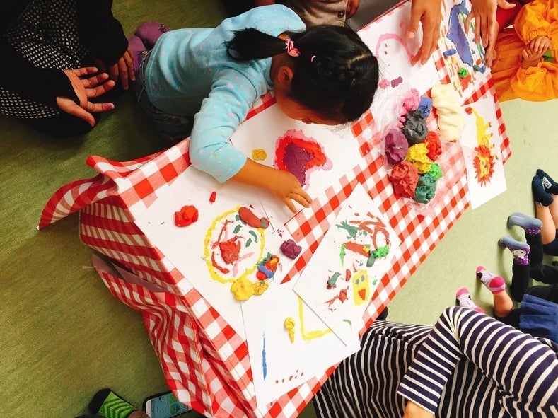 カラフルな油ねんどで、桜の木や、虹、恐竜など、思い思いの絵を描く子どもたちは真剣そのもの!