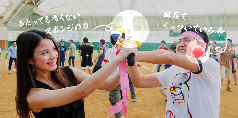 チームを組み、スポンジでできた当たっても痛くない刀を利き手に、反対の腕に「命」と呼ばれる玉をくっつけます。