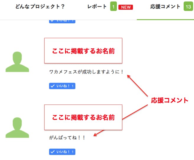⑤応援コメントにお名前が記載されます