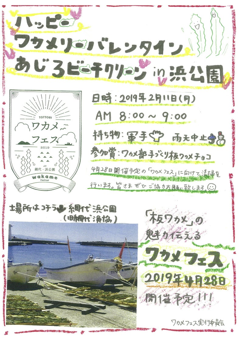 2019/04/01 22:02ご支援ありがとうございました! 地元の鳥取県から、板ワカメつながりの島根県から、はたまたジャマイカから。 あたたかいご支援、本当にありがとうございました。 ドキドキしながらの募集期間でした。 ひとつひとつのお気持ちをまずはリターンとしてお返しいたします。 コースによって、お届け時期が異なりますが、楽しみにお待ちください。 4/28ワカメフェスの開催へ! ワカメを楽しむもりだくさんのワカメフェスは、4月28(日)です。 平成最後の日の2日前。令和になる3日前。 初めてのワカメフェスの準備でバタバタするかと思いますが、楽しいイベントにしますので、ぜひ遊びに来てください。 また、イベントスタッフも大募集中です。 ご興味がある方は、ワカメ部までお問い合わせ頂けますと嬉しいです。 ワカメ部 HP もっと見る