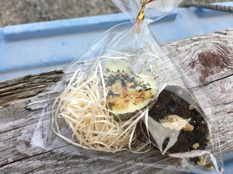 2/11海岸清掃の参加賞として、板ワカメ入りの"板ワカメチョコ"を配りました