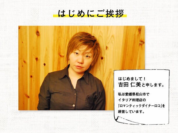 初めまして!愛媛県松山市で イタリア料理店「ロマンティックダイナーロコ」を経営しております、 吉田仁美と申します。