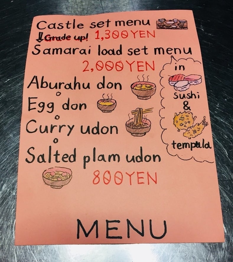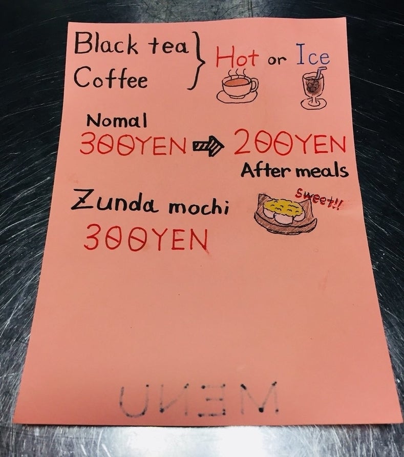 以前、英語を喋る外国の方がいらっしゃったのですが、意思疎通が上手くできておりませんでした。これではダメだと、せめて注文ぐらいはスムーズに出来るよう、簡単なイラストつきで英語表記のメニュー表を作成しました。