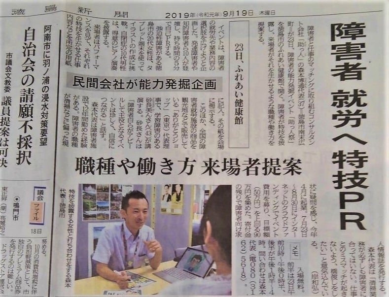障がい者専門求人情報誌「助っ人」徳島新聞に掲載されました。現在、11月の後半から本格的に求人情報誌「助っ人」のご案内が出来るようになってきました。また、この度新聞にも掲載されました。今回の求人情報誌については、「企業×福祉施設」を中心に考えています。障害者雇用については、さらに深めていきたい分野ですが、徳島で今行うべきことは、まずは企業は福祉施設の事を知る事。福祉施設は企業の現状を知る事だと思っています。 企業は、障害者雇用の前に、実習生の受け入れをしたり、委託作業等をお願いしたりするなど、まずはきっかけ作りが必要だと思っています。いろんな方とお話する機会が多くなっていますが、一番多い質問は「障がい者の方は何が出来るの?」です。これは、障がい者お仕事発掘イベント「助っ人祭」で行ったように彼らが出来る事、実行していることをもっと発信していく必要があります。最近は、森本自身ラジオなどにも出して頂いたりと、メディアを通じて彼らの出来る事を発信し、「清掃」以外の職種や仕事をもっと発掘していく必要があると思っています。 最近では、介護現場で助っ人として働いている方ともよく話をします(10月から介護現場にて採用)デイサービスにて余暇の時間を一緒に過ごしたり、レクリエーション等に参加したりしています。介護現場では、人手不足により、排せつ支援などが中心となり、日常の会話等が減り、ゆとりがない状態です。そんなときに、彼らの出来る事を活かすことは可能だと思っています。人とのコミュニケーション。人手不足のよる現場の「助っ人」。上記のようにレクリエーションに参加したりと、出来る事と人手不足をマッチングすれば、たくさんの障がい者の方が助っ人として活躍する人も増えてくると思っています。 求人情報誌を発行するにあたり、経営者や人事の方と話す機会が増え、人手不足だから「外国人労働」を受け入れするために動いていると聞いたりします。否定はしませんが、外国人労働を行うために、現地の視察に行ったり、従業員が外国語の勉強したり・・・。これを障害者の分野に置き換えると・・・。企業と福祉施設の接点が徳島においては少ないのではないかと感じつつあります。「企業×福祉施設」との関係がうまくいくと、自然と雇用が促進されると思っています。コミュニケーションが苦手と言われがちの障がい者ですが、日本語は理解できるし、人事担当の方などが福祉施設に視察に行ったり、障害について福祉施設現場で学ぶことが出来れば、雇用はもっと可能性が広がると思います。話しは求人情報誌に戻りますが、発行は、1月16日・17日あたりになるのではないかと思っています。発行後、郵送にて送らせて頂きたいと思っています。また、次回は4月頃に2冊目の発行を考えています。(2冊目の郵送予定は今のところありません)2冊目の発行は、もう少し突っ込んだ内容等を考えています。就労系の事業所(就労継続支援A・B型・就労移行支援等)では、就職率が1%(全国的に)と言われている現状です。彼らが就職する確率って、本当に1%なんでしょうか・・・。福祉施設も、今考えるときが来ているのではと思っています。企業は、経営で潰れていく企業もたくさんあります。福祉施設は、潰れていく事はほとんどない(A型はありますが)。この1%の数値を、徳島県でもっと上げるために、やるべきことをやっていく。誰の為に仕事なのかも訴えかけていきたいと思っています。また「働く事」だけではなく、徳島では「通勤」で就職を諦めている方もいます(現場では働く力があるが、通勤手段の確保が出来てなかったり、習得できてなかったり)。ここも、近い将来環境を整え、彼らの可能性を広げていきたいと思っています。 長くなりましたが、やるべきことは1つずつしか出来ませんが、出来る事はたくさんあると思うとワクワクしています。 一番やりたいことは「助っ人」として活躍できる人を増やすこと。「清掃」以外の職種を発掘することです。年内最後まで、障がい者専門求人情報誌「助っ人」の案内を行っていきます。ご協力頂いたおかげで、求人情報誌が発行できます。年内最後まで走り続けたいと思います。協賛や広告も継続して募集をしています。 ぜひ、今後とも応援してください。皆様の、今後のご活躍も祈念いたします。 増刷もしくは、増ページを検討中です。