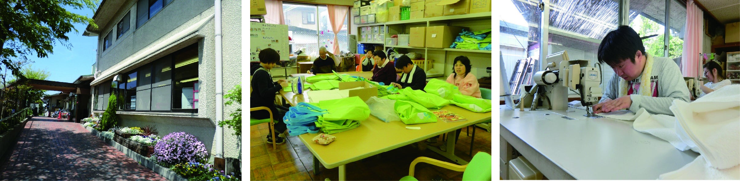 エコバッグは大阪府内の福祉作業所である岸和田障害者共同作業所で製作します。1977年に誕生した事業所で、障害者が仕事を通じて日々成長し、社会参加する場として現在まで40年以上続けてきました。内職やリサイクルなど様々な仕事にチャレンジし、その中でも縫製グループは早い時期からミシンを取り入れ、安全装置付きのミシンの開発によって、てんかん発作がある人や、マヒのある人でも縫製作業に従事しています。ふきん、クッション、トートバックなど様々な縫製商品の製作や、医療用ゴミ袋、タオルのヘム加工などの委託製造をしています。 現在14名が布を折る人、アイロンをかける人、ミシンをふむ人、袋に入れる人など役割分担をして仕事をすすめています。
