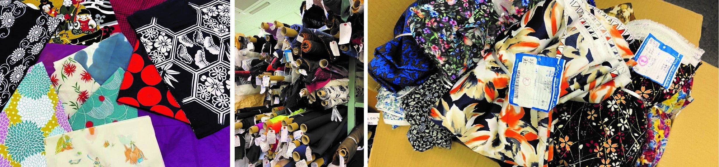 私たちのエコバッグ製作用の布は、サクヤヒメ有志や大阪で繊維業を営まれる宇仁繊維株式会社さんにご協力いただき、使わなくなった端布を活用します。