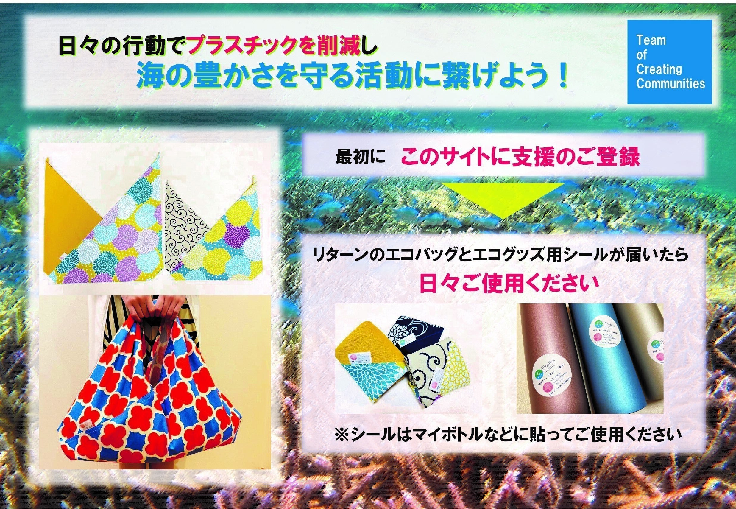 このプラス10万円で福祉作業所でのエコバッグ製作のお仕事を更に100個分追加できます。そして豊かな海を守る活動を更に繋げていきましょう。