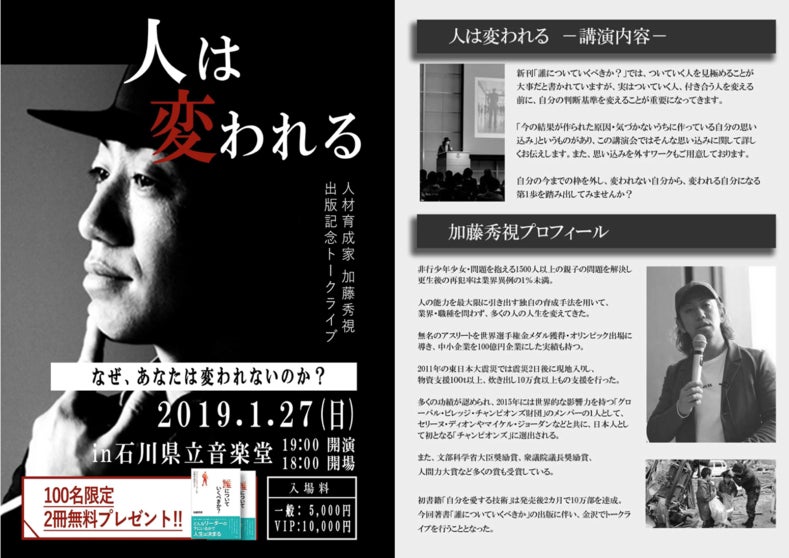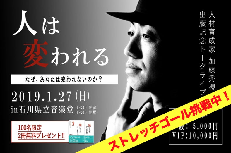 今回、僕に変わる大きなきっかけを与えてくれた株式会社マーヴェラスラボのCEOリーダーシップ、組織開発専門ベンダーである加藤秀視(かとうしゅうし)さんを金沢にお呼びして、「人は変われる」をテーマに講演会を開催するためクラウドファンディングに挑戦します!