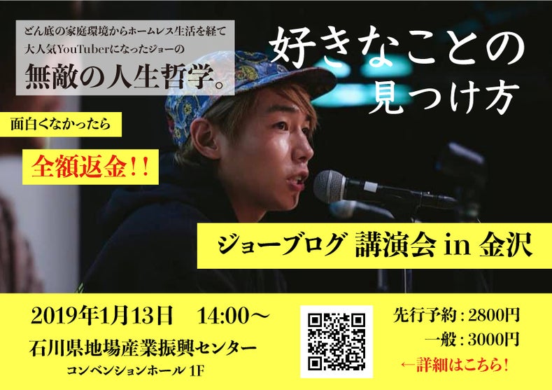 なので上記のように宣言するジョーさんを、今回は僕が北陸にお呼びして、どうやって自分が心から好きなことを見つけるのか、そしてどうやったら自分の好きなことでメシが食えるようになるのか。その具体的な方法を講演していただきます。