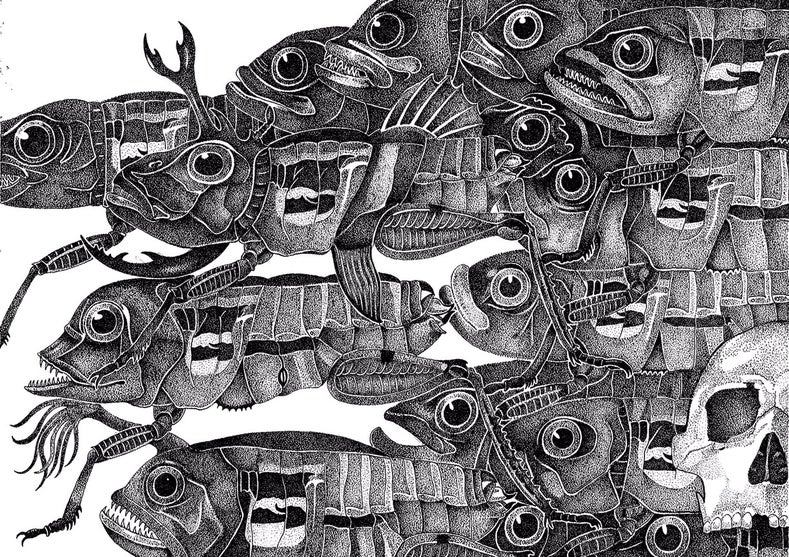 【悪夢の魚群】点描画(画用紙・ミリペン黒)(26cm×36cm)