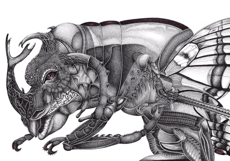 【脅威Ⅲ(ドラゴン)】点描画(画用紙・ミリペンカラー)(26cm×36cm)