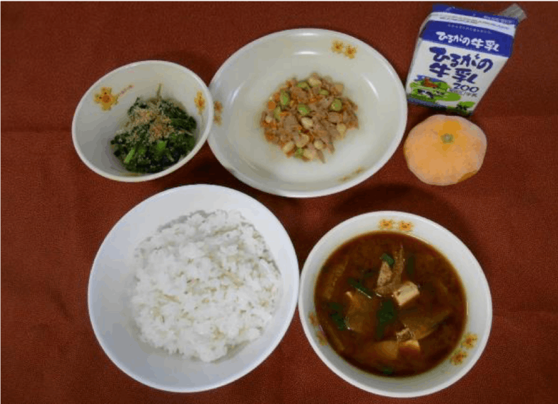 今日は、「ぎふ犬(けん)マーク」のついた「ふるさと食材の日」です。すべての料理に岐阜県産の食材を使っています。「地産地消」とは、その地域で作られた農産物や水産物を、その地域で消費することです。「新鮮で安心な旬の食材を買うことができる」、「輸送の費用が抑えられる」、「食料自給率のアップにつながる」など、メリットがたくさんあります。お米や牛乳はもちろん、大豆・にんじん・えだまめ・小松菜・太もやし・豆腐・油揚げ・岐福(ぎふ)味噌、みかんが岐阜県産の食材です。給食は、ただ食べるだけでなく、住んでいる地域の特産品を知り、伝統的な食文化を味わう経験を積んで欲しいという願いも込めて作っています。ふるさとの味を知り、ふるさとを大切にしていきましょう。