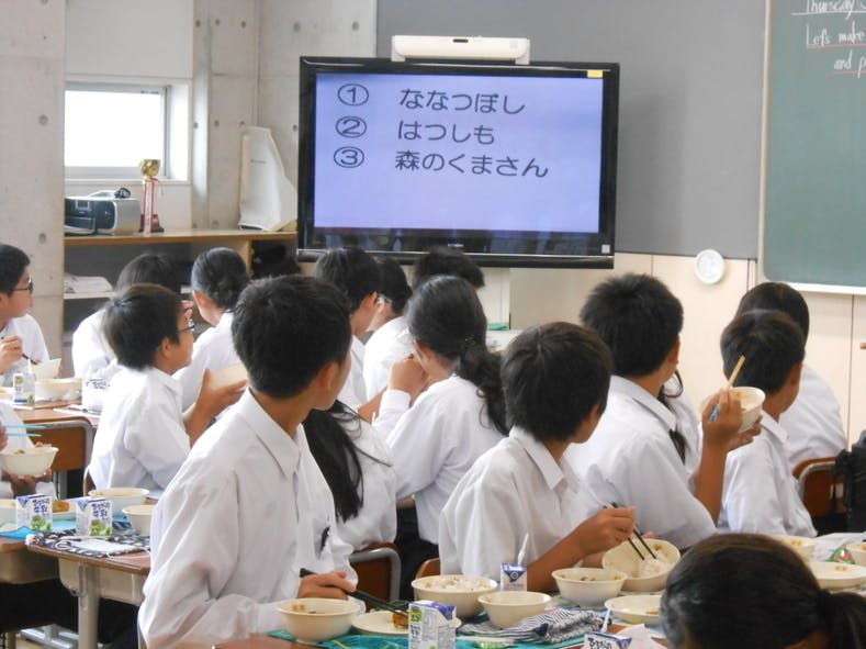 ふるさと食材の日の給食では、毎回食材を紹介したり、給食の時間に給食委員会でふるさと食材クイズなどを行ったりしていますが、 中々生徒の意識の中にふるさとの食材が定着しないのが課題です。これからも、学校給食を活用して、給食委員会活動を工夫をしながら、食文化や郷土への関心を高める指導を行っていきます。