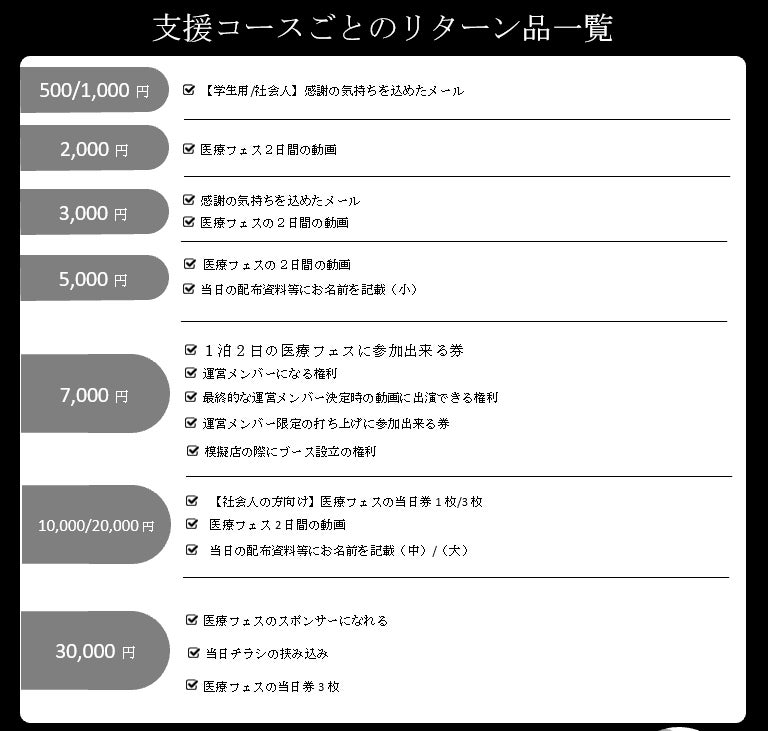 支援コースごとのリターン品一覧