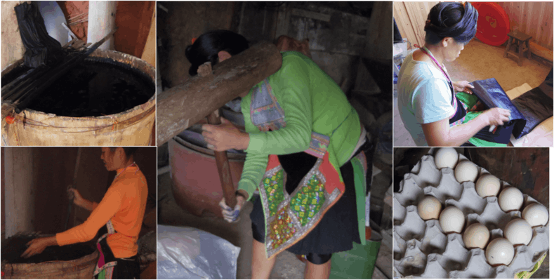 ▲芭莎村での亮布作りの様子。左2枚:藍染め、中央:叩き、右2枚:光沢加工
