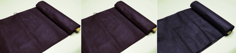 もう一つの特徴として、亮布は水には弱く、濡れると赤色味や光沢は失われてしまいます。