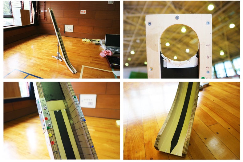 選手の指示により、ランプの角度を調整し、ボールを設置します。