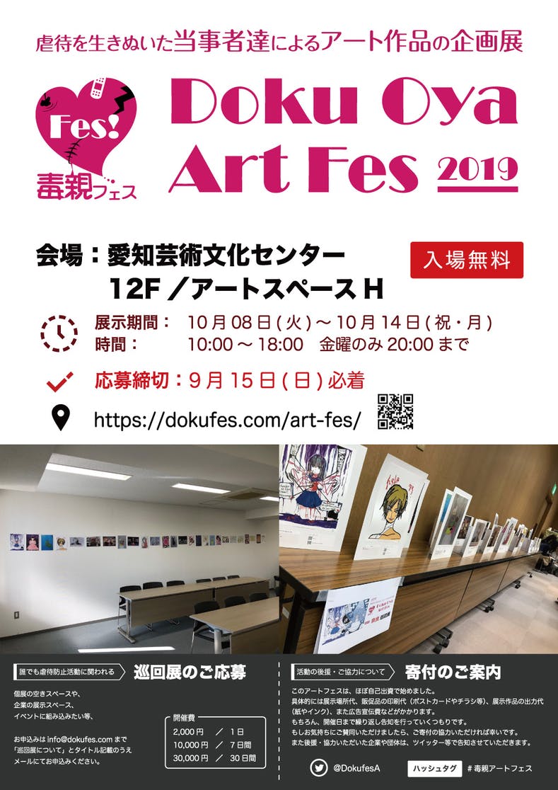 2019/10/02 00:149月30日23時59分を持ちまして、クラウドファンディングが終了いたしました。 おかげさまで、目標金額の50%に達する65,000円となりました。ご支援いただいた皆さまのお気持ちにお応えするべく、大切に活用させていただきます。 また、クラウドファンディングを通じて、多くの方々と出会えましたこと大変嬉しく思います。 クラウドファンディングへのご支援の結果や今後の情報につきましては、なくそう虐待あいちの公式ブログやTwitter、Facebookページ等で随時お知らせいたします。 クラウドファンディング挑戦中、皆さまからいただいた多くの応援コメントや励ましのお言葉、そしてRTシェア拡散へのご恩を胸に刻み、地道に活動を続けていきたいと思います。 私たちの活動が「虐待のない社会」実現に向けての一助となるよう頑張ってまいります! 皆さまからのご支援、応援、本当にありがとうございました! 今後とも、各地で開催される「子ども虐待防止策講演会」と、各地の実行委員会チームそしてなくそう虐待あいちをどうぞよろしくお願いいたします。 なくそう虐待あいちスタッフ一同 「毒親アートフェス」のお知らせ 『虐待サバイバーのための、一歩を踏み出すアート展』です! 10月08日(火)~10月14日(祝・月) 愛知芸術文化センター 12F アートスペースH 主催:浅色デザイン https://dokufes.com/art-fes/ 今後の「子ども虐待防止策講演会」開催予定11/2(土)東京 主催:No More Abuse Tokyohttps://nxmxaxt.blogspot.com/ 11/9(土)愛知 主催:APU家族研究会+共催:なくそう虐待あいちhttps://twitter.com/apu_f_1109https://child-rights-nagoya.blogspot.com/ 11/30(日)福岡 主催:ふくおかachttps://fukuokaac.blogspot.com/ 12/14(土)町田 主催:きがるにつながる町田https://noabusemachida20190829.blogspot.com/ 12/15(日)大阪 主催:Power to the Children in Osakahttps://ptc-osaka-2019.blogspot.com/ もっと見る