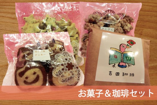 ※お菓子&珈琲セット内訳:吉田珈琲(豆100g)、カゴシネクッキー、ザクザクフルーツ、豆乳クラッカー