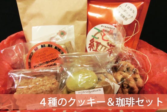 ※4種のクッキー&珈琲セット内訳:ココナッツクッキー、知覧茶クッキー、黒食クッキー、チョコココナッツクッキー、吉田珈琲(豆100g)、こども紅茶(50g)