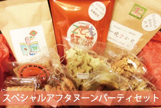 ※スペシャルアフタヌーンパーティセット内訳:豆乳クラッカー、チョコココナッツ、ザクザクフルーツ、ココナッツクッキー、知覧茶クッキー、黒食クッキー、ゴマスティック、吉田珈琲(豆100g)2、こども紅茶(50g)、一晩ねかせ茶(50g)