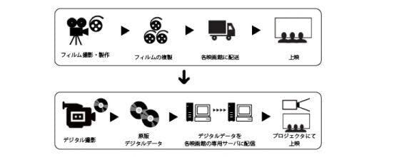 これまでは配給元から映画の35mmフィルムやブルーレイ・ディスクなどが各映画館に配送され、それを映写機などで上映していました。