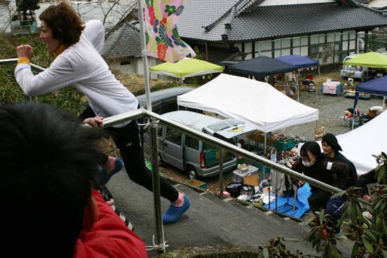 ▲急な階段を駆け上がる「福女」レース、白熱しました