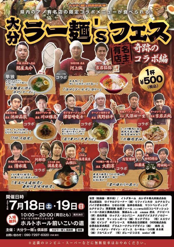 • 皆さま!大変お待たせ致しました!   第2回大分ラー麺'sフェス~らーめん県おおいた創生編~ 参加店舗・コラボを発表致します!!     ①マルキン製麺所(ゴールドプランニング) × 大分商業高等学校商業調査部 × 大分ラー麺’s倶楽部   ②壱丁目ラーメン × 新友会ひまわり畑「喫茶ひまわり畑」   ③豚骨ユニバーシティ × 和風創作ダイニングkirara × 別府溝部学園短期大学食物栄養学科   ④ラーメン浅野2号 × 豊後ラーメン一刀竜   ⑤トラの夢(エピソード1) × スペシャルゲスト ミスターX!?   ⑥別府冷麺六盛 × 大分ラー麺’s倶楽部   ⑦佐伯のラーメン三男坊・点法輪 1日毎に入れ替え (佐伯ラーメンFANフォロー)   ⑧大分ラーメンつけ麺 まる重 (単独)   ⑨熊本 麺屋一連 (単独)   ⑩北九州 テールらぁあ麺 よし久 (単独)   皆さまの好きなラーメン屋さんの名前はありましたでしょうか? 今回のメインテーマは「産・学・福の連携」です。 ※産=民間企業  学=教育機関 福=福祉   大分有名ラーメン店主が地元高校・短期大学・障がい者就労施設と連携してのコラボラーメンの提供、それが次なる試みです。さらに、前回とは違った店主同士のコラボラーメンもあり、一体どんなラーメンが生み出されるのか今から楽しみです!   皆さま!引き続き支援のご協力をお願い致します!       もっと見る