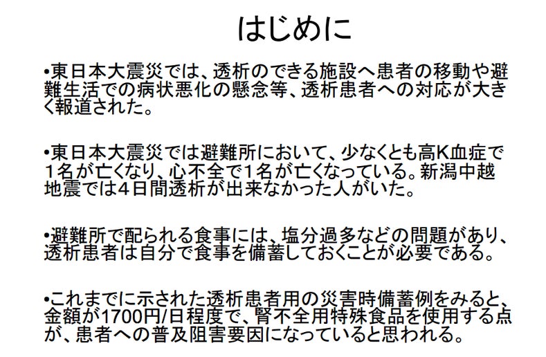 熊谷先生から頂いた資料と、透析患者緊急時持ち出しリストを照らし合わせて、避難袋の中身をまとめたら、またUPしますね。