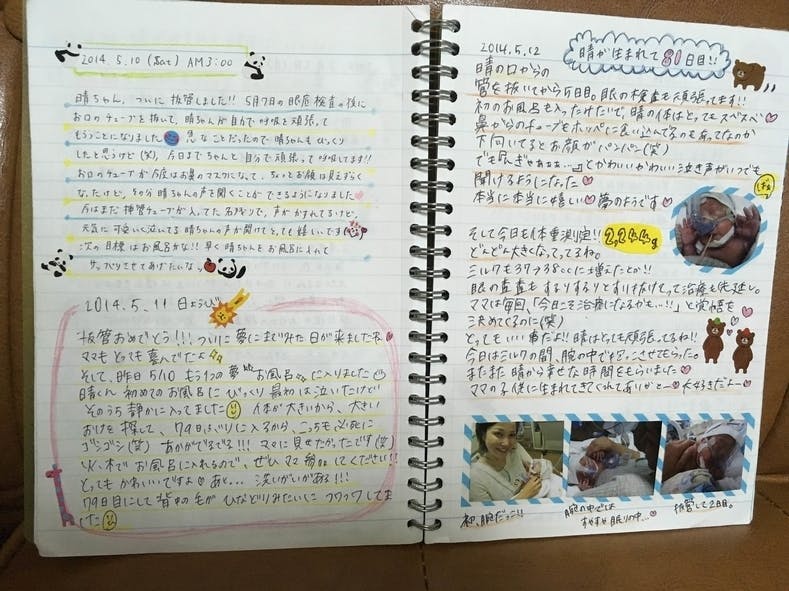 (生まれてから退院まで見守ってくれた担当看護師さんとの交換日記です。一生の宝物!)