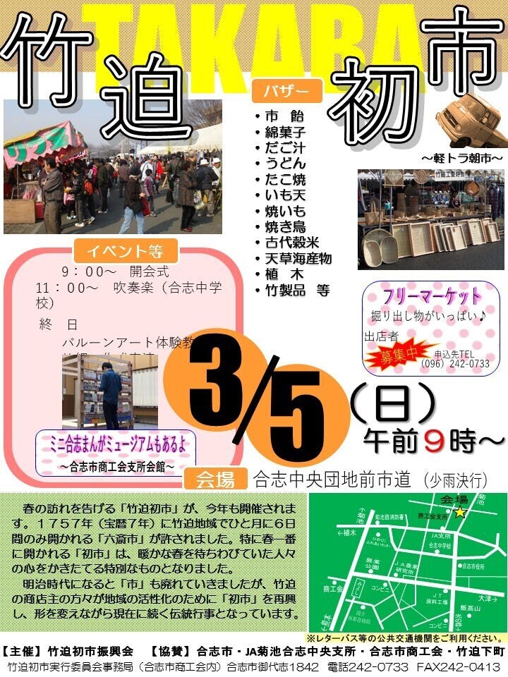 昔、合志郡の半分を占めていた「竹迫手永」という役所があった竹迫中町一帯で開かれていた「市」で、江戸時代より続くといわれる竹迫に春を告げる初市です。