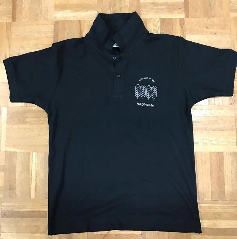 コンセプトの葉隠をイメージし、黒のポロシャツにしています。佐賀のデザイナーK氏にデザインしてもらったロゴを白抜きにしているシンプルでかっこいいポロシャツになりました。