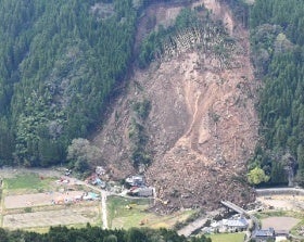 2018年4月11日午前3時50分ごろ、大分県中津市耶馬渓町金吉(かなよし)で裏山が大規模に崩落し、4軒が土砂にのまれ、3世帯の男女計6人と連絡が取れなくなりました。裏山は斜面が長さ200メートル、幅200メートル、高さ約100メートルにわたって崩落しており、落石も見られました。県警、消防、自衛隊などが約300人態勢で土砂の撤去作業が開始されました。