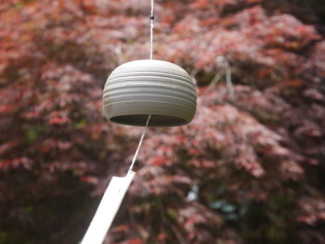 ▲高取春慶さんの陶芸による手作り風鈴。お盆には、7個の風鈴を設置します。