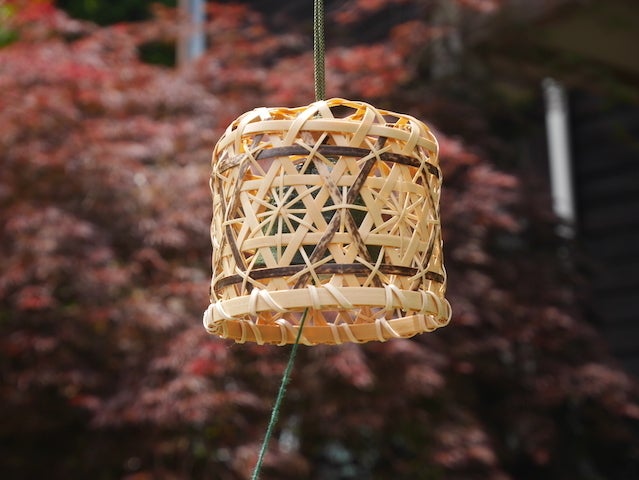 別府竹細工では、いろんな編み方があるのですが、その中で「花六ッ目編」が気に入り、自然の素材の竹を使用した「花六ッ目編」を作っています。今回の風鈴作りでは、犠牲者や被災地の皆さんを癒やしたいという想いから「花六ッ目編」の風鈴を作成してみました。