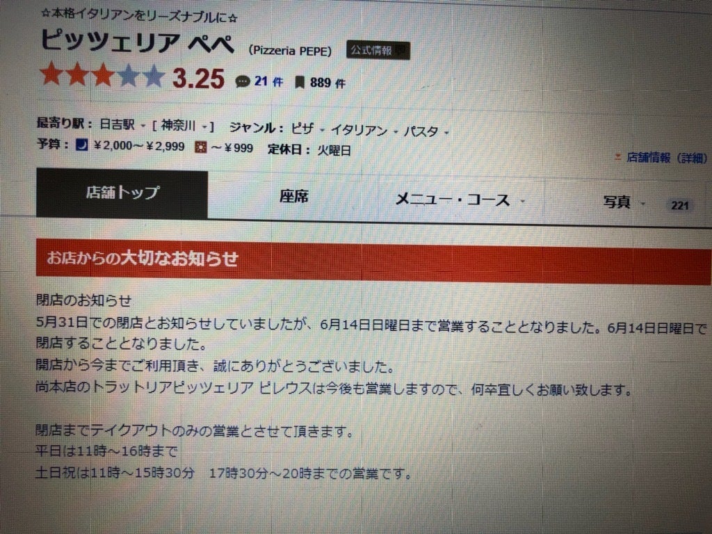 (ぺぺ、閉店のお知らせ)