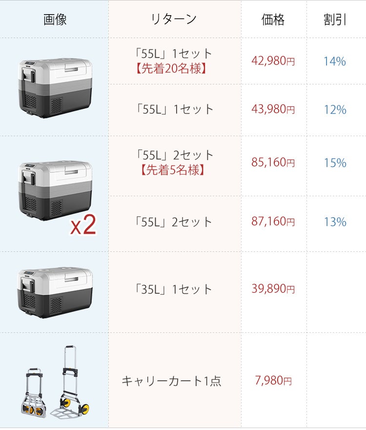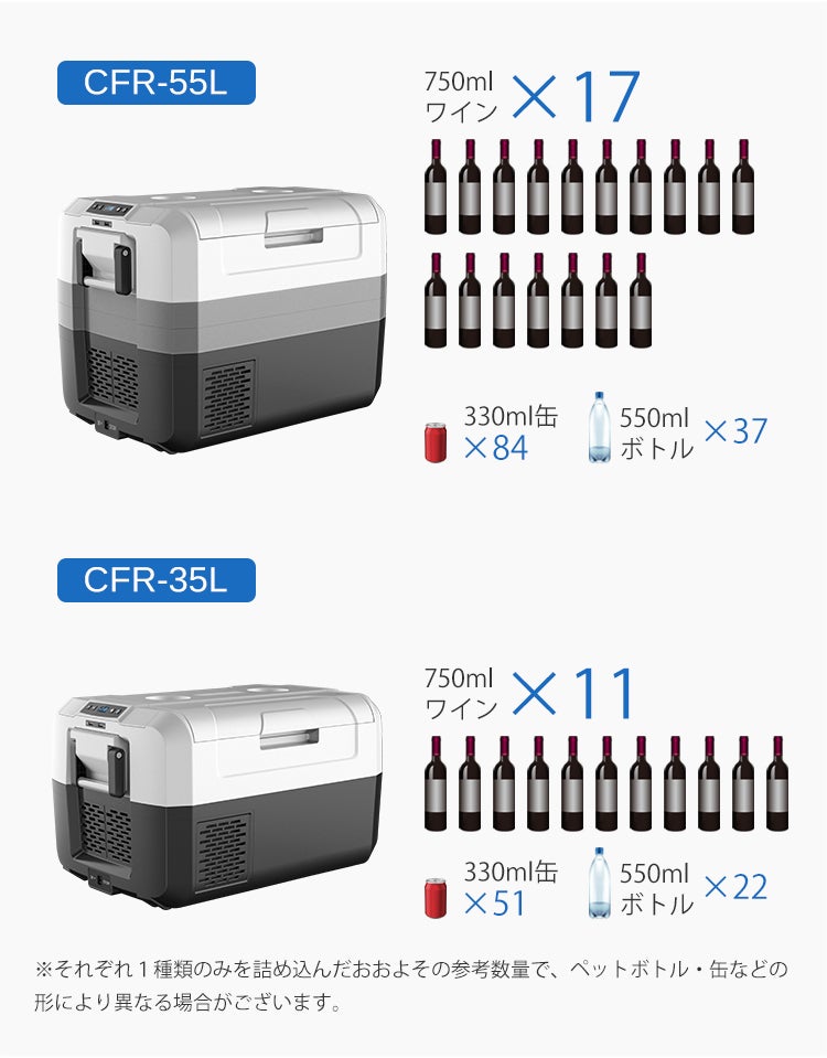 前回実施モデル15L/32Lの小容量タイプを一新し、今回は35L、55Lに容量UP!収納できる飲料は前回モデル2倍を実現しました。