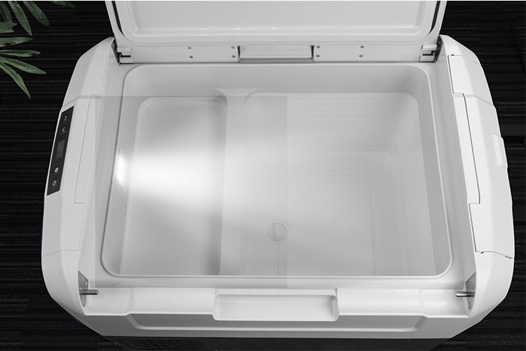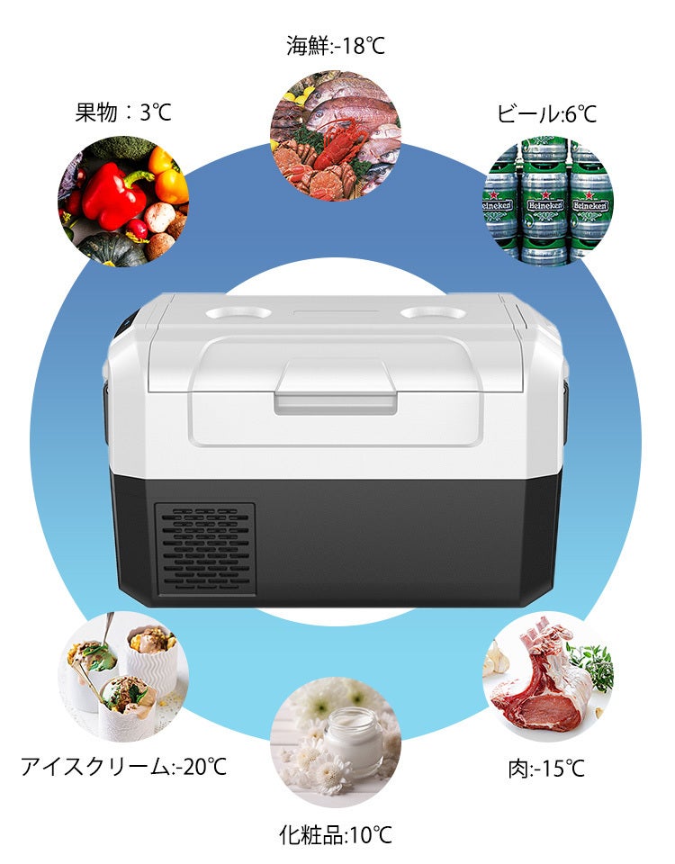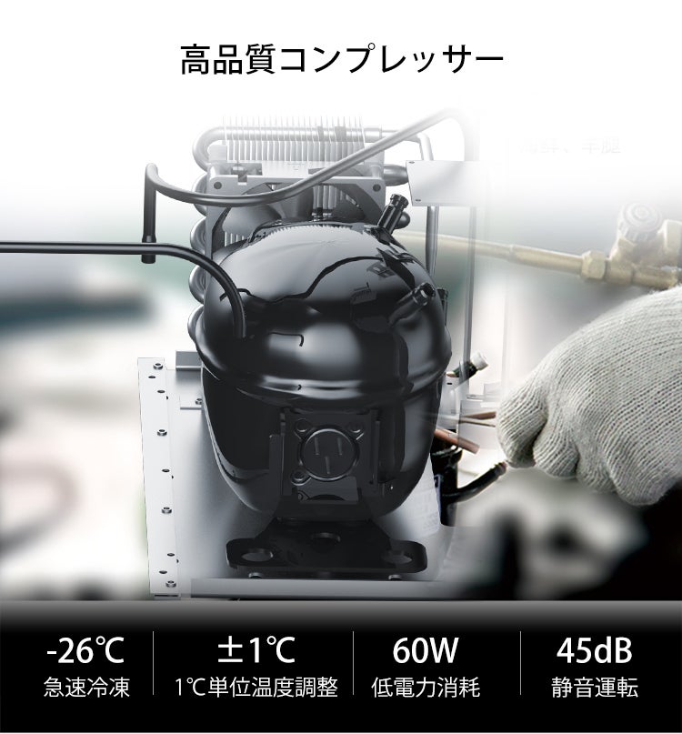 高性能コンプレッサー搭載、-26℃急速冷凍。電源がなくても、保冷庫として最大25時間長時間使用。
