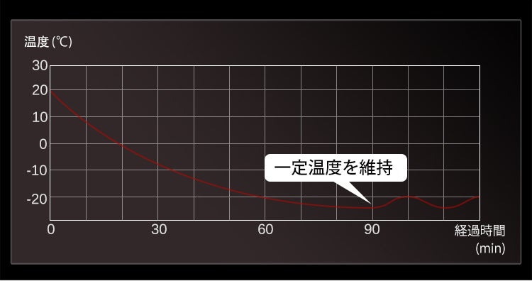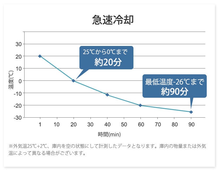 強力な冷却機能で、室内温度が25℃の場合、たった20分程度で0℃まで冷やすことができます。最低温度-26℃まで冷やす場合でも90分ほどしかかかりません。