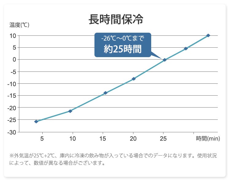 A:保冷能力に優れた断熱材を採用しているため、-26℃から0℃まで約25時間ほどかかります。(※外気温が25℃、庫内に冷凍飲料が入っている場合)