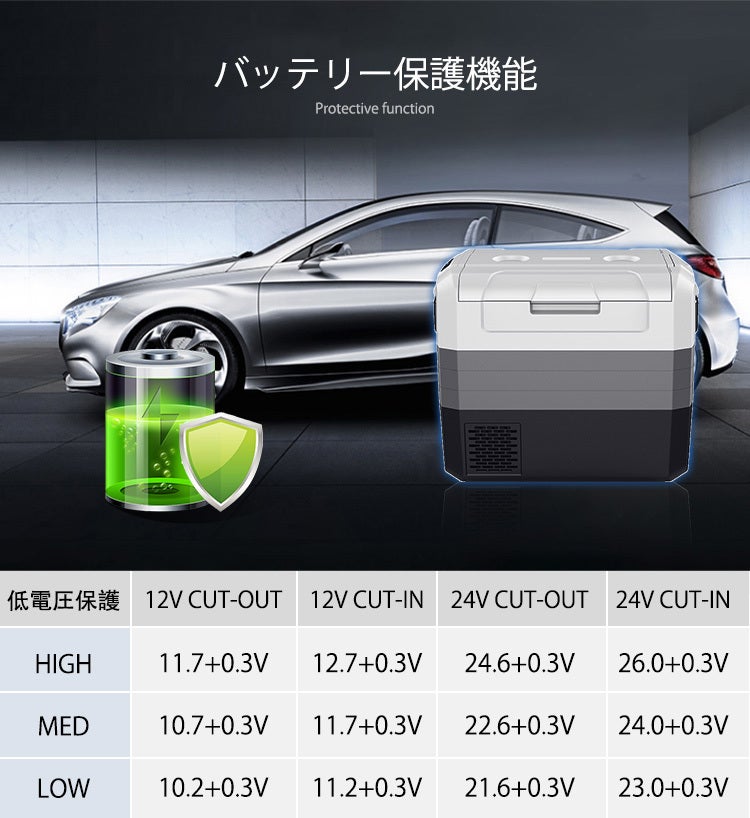 H・M・Lの3段階低電圧保護機能搭載。車のシガーソケットに差したままお使いの際、自動的に車両の電圧を感知し、バッテリーが弱まってきたら、冷蔵庫が自動的に電源OFF!電圧が設定値から回復したら、再起動。そのため、車のバッテリーが上がってしまい、車がうまく起動できない心配もありませんので、安心してご利用いただけます。