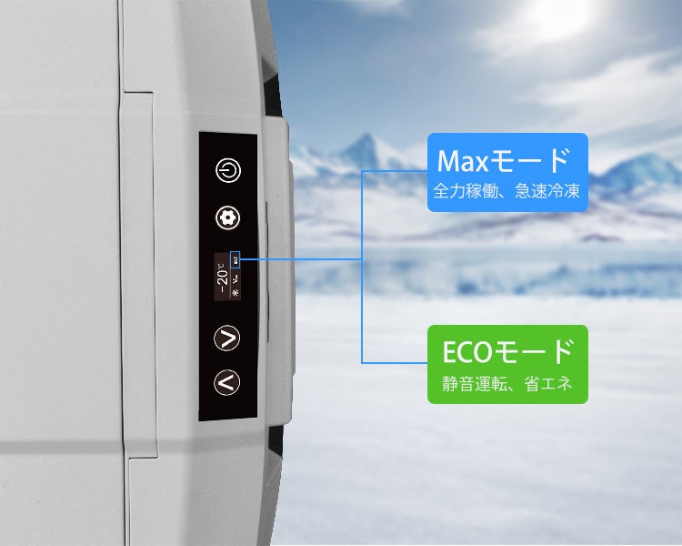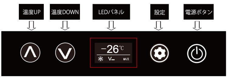 設定ボタン: 温度表示(摂氏温度℃/華氏温度℉)、コンプレッサー運転状態、電圧保護モード(H/L/M)、ECO/MAXモードを設定することが可能。