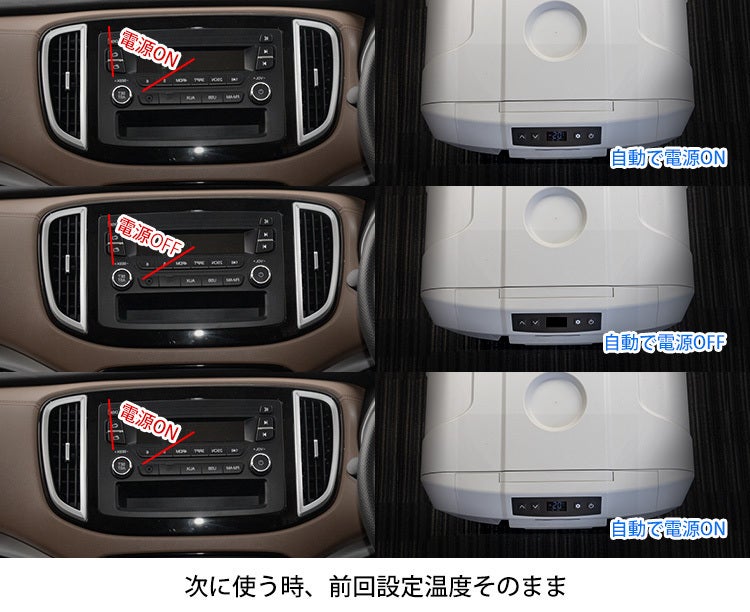 車の電源が入ると、冷蔵庫が自動的に電源ON。車の電源を切ると、冷蔵庫が自動的に電源OFF。再び給電が始まると給電停止する前に設定した温度そのまま、改めて温度を再設定すること不要です。