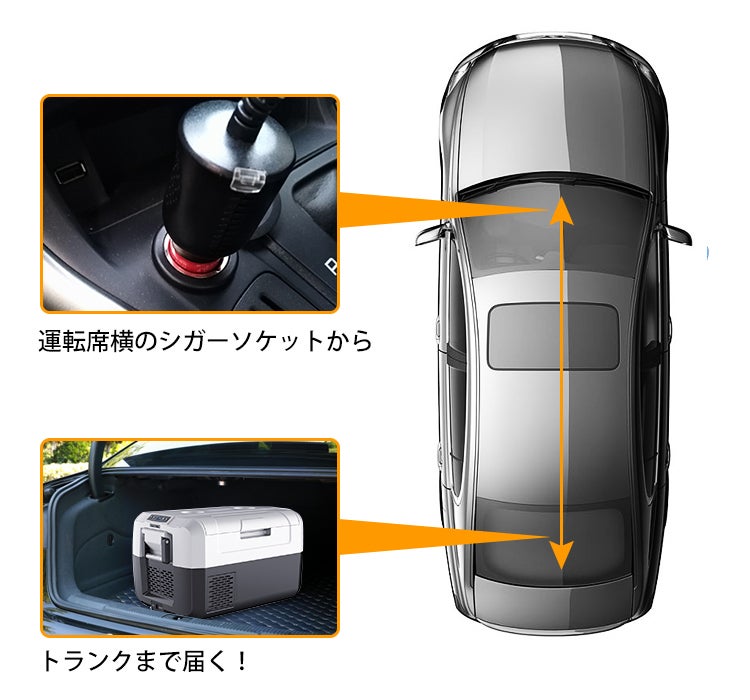 長さ約3.5mのDC用コードは、標準的なハッチバック型乗用車のトランクも、SUV車のトランクにまでも簡単に届きます。大勢でお出かけする時や、車内で食事を楽しむときも座席をフルに活用できます!