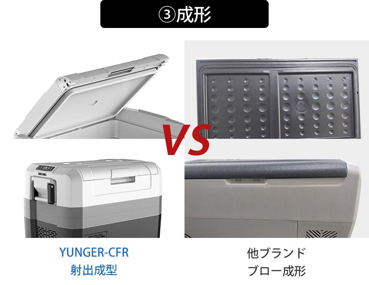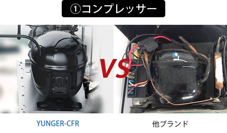普通のコンプレッサーだと、振動の強い環境の下に使うと、故障率が高いのですが、「YUNGER-CFR」はスウェーデンのDometic社との共同投資で生産した高品質コンプレッサーを採用、普通の製品の性能より、耐震効果が良く、強い振動など厳しい状況の下でも高品質な冷蔵冷却効果を発揮し、長時間使用できます。