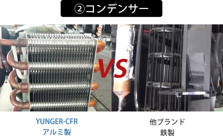 運転中の熱を効率よく発散し、より効果的に冷却冷凍の能力を高めるため、「YUNGER-CFR」はアルミ+銅製のコンデンサーを採用、普通の鉄製のタイプと比べてみると、放熱効果がより良く、高品質の冷却効果が得られます。